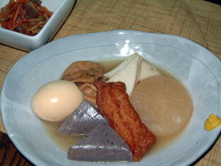 【内容】 ・大根 ・イカ巻きさつまあげ ・こんにゃく ・卵 ・がんも ・はんぺん 【コメント】 最近数日間洋食の献立が続いていたので、『おでん』にしました。 都心でも小雪が舞う寒い日だったので、あつあつの料理はぴったりでした。 『おでん』の他、『蓮根とにんじんとこんにゃくのきんぴら』を作りました。 ダイエットも兼ねて野菜中心のヘルシーメニューです・・・。