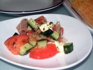 1.トマトは少し大きめに切る。きゅうり、チーズは1.5cm位のさいの目に切る。生ハムは食べやすい大きさにする。